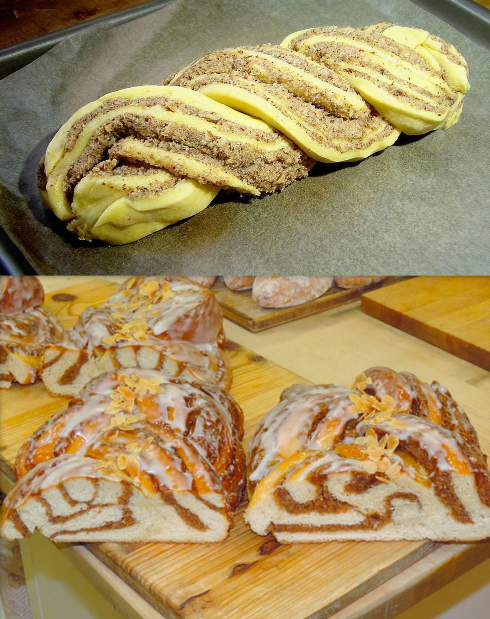 Składnik: Do ciasta drożdżowego: 400 g mąki 25 g drożdży 120 g mleka 60 g masła 40 g cukru 1 jajko (on) Do nadzienia: 100 g mielonych orzechów laskowych 50 g cukru 40 g bułki tartej 120 ml mleka 1 szczypta (y) cynamonu Przygotowanie: