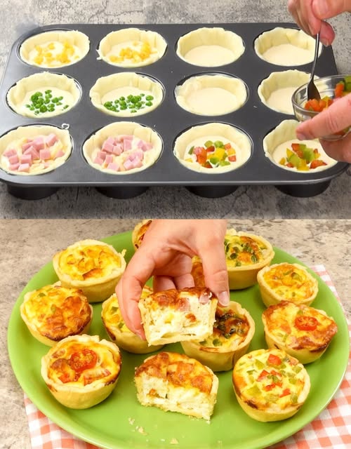 Składnik: 1 bułka ciasta kruchego (lub francuskiego) 3 jajka 100 g ricotty 130 g jogurtu 1 łyżeczka oleju słonecznikowego Sól, pieprz, oregano Wypełnienie do wyboru: Gotowanie szynki z tartym serem Kukurydza Groch Papryka słodka (kolorowa) Gotowanie pomidorów cherry: