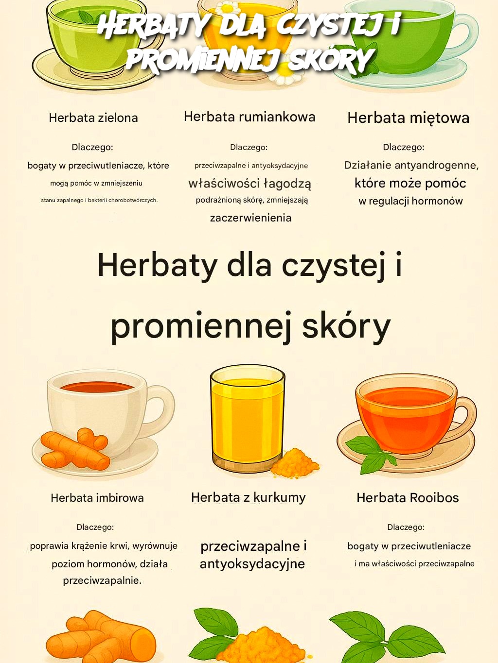 Herbata nie tylko koi — to potężny naturalny środek na uzyskanie czystszej, zdrowszej skóry. Oto lista herbat wraz ze składnikami, podstawowymi przepisami i tym, dlaczego są tak korzystne: 🍵 Zielona herbata Składniki: 1 torebka zielonej herbaty lub 1 łyżeczka luźnej zielonej herbaty 1 szklanka gorącej wody Podstawowy przepis: Zaparzaj torebkę zielonej herbaty (lub liście) w … Read more