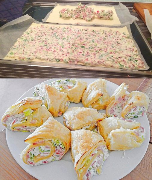 Bułka Flammkuchen z 200 g szynki i 1 rolką ciasta francuskiego z chłodni 😋 1 opakowanie serka śmietankowego lub śmietany 200 g szynki…