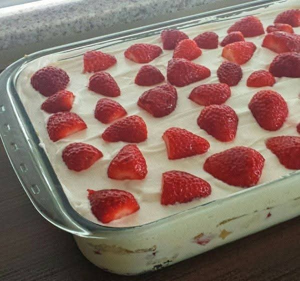 ➡️ Składnik: Do kremu: 1 puszka mleka skondensowanego (395 g) 1 pudełko śmietany (200 g) 1 puszka jogurtu naturalnego (170 g) 1 bezbarwna koperta żelatynowa bez smaku (12 g) 5 łyżek wody (do zwilżenia żelatyny) Do truskawek: 2 szklanki (herbata) pokrojonych truskawek 2 łyżki cukru Sok z ½ cytryny ➡️ Tryb gotowania: