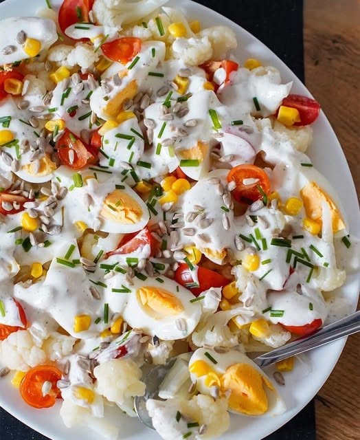 Sałatka z kalafiora, jajek, kukurydzy i pomidorów. Zdrowa i prosta sałatka, która sprawdzi się zarówno na kolację, jak i jako przystawka na domowe przyjęcia.